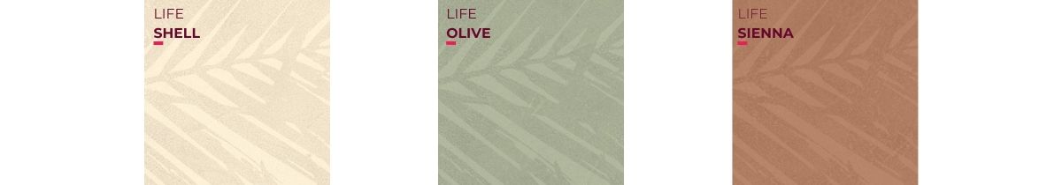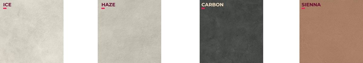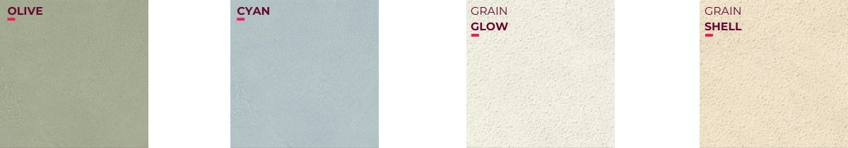 Bohatá paleta farieb zahŕňa pri univerzálnych obkladoch na stenu aj podlahu svetlé Glow a Shell, hnedé Camel a Tan, šedé Ice a Haze a čiernu Carbon. Pri obkladoch určených výhradne na steny potom Glow, Shell a Ice dopĺňajú ešte sýto hnedá Sienna, zelená Olive a modrošedá Cyan. Všetky odtiene reflektujú aktuálne trendy, dodávajú priestoru teplo a prispievajú k vytvoreniu útulnej a harmonickej atmosféry.